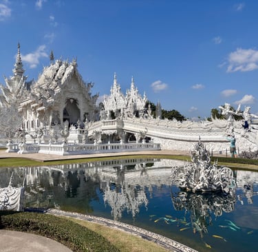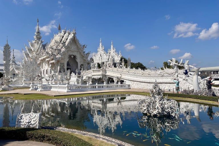 Non puoi dire di aver visto Chiang Rai senza visitare il Wat Rong Khun, meglio conosciuto come il Tempio Bianco. Questo capolavoro architettonico, creato dall'artista visionario Chalermchai Kositpipat, sembra uscito da un'altra dimensione: totalmente bianco con specchi scintillanti, sculture surreali e simbolismi profondi. Il ponte che attraversa un mare di mani rappresenta il cammino verso l'illuminazione, mentre all'interno troverai affreschi con riferimenti a Batman, Matrix e Star Wars!!